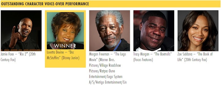 Huge congrats also to the wonderful Loretta Devine who voices Hallie in Doc McStuffins on her win for Outstanding Character Voice-Over Performance beating out Jamie Foxx, Morgan Freeman, Tracy Morgan and Zoe Saldana!