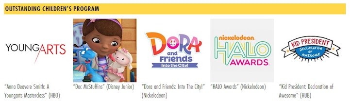 Doc McStuffins was nominated in the Outstanding Children's Program category alongside Dora and Friends: Into the City!, HALO Awards, Kid President: Declaration of Awesome and Anna Deavere Smith: A Youngarts Masterclass.