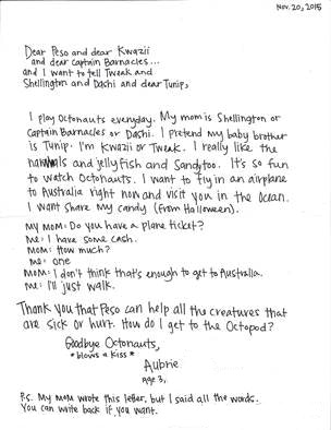 We got some ADORABLE fanmail sent into us for the Octonauts by 3 year old Aubrie all the way from California!