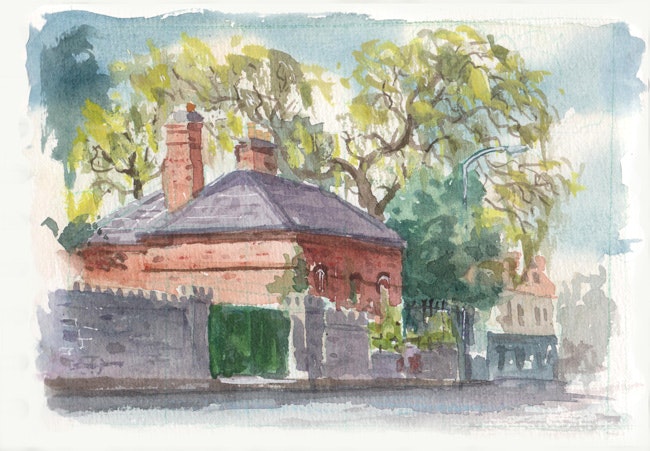 Olly: I did this watercolour painting in a lovely cafe opposite the entrance to the Botanic Gardens in Glasnevin. It was a busy area with lots of traffic flying up and down and people running across the road.