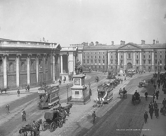 A high angle looking down over College Green in Dublin. It is the turn of the century and the streets are full of men in top hats walking and horse drawn carriages.