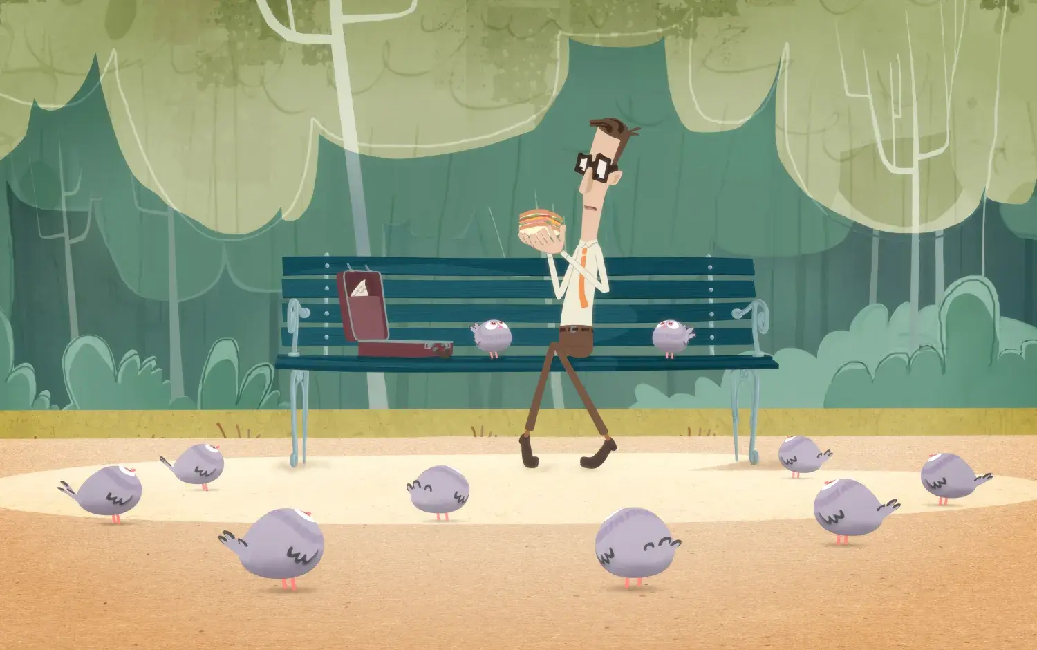 On a lovely summer’s day, a business man contentedly sits down to eat his lunch in the park. He gives a piece of his delicious sandwich to a couple of the local pigeons, but once they get a taste they want more.